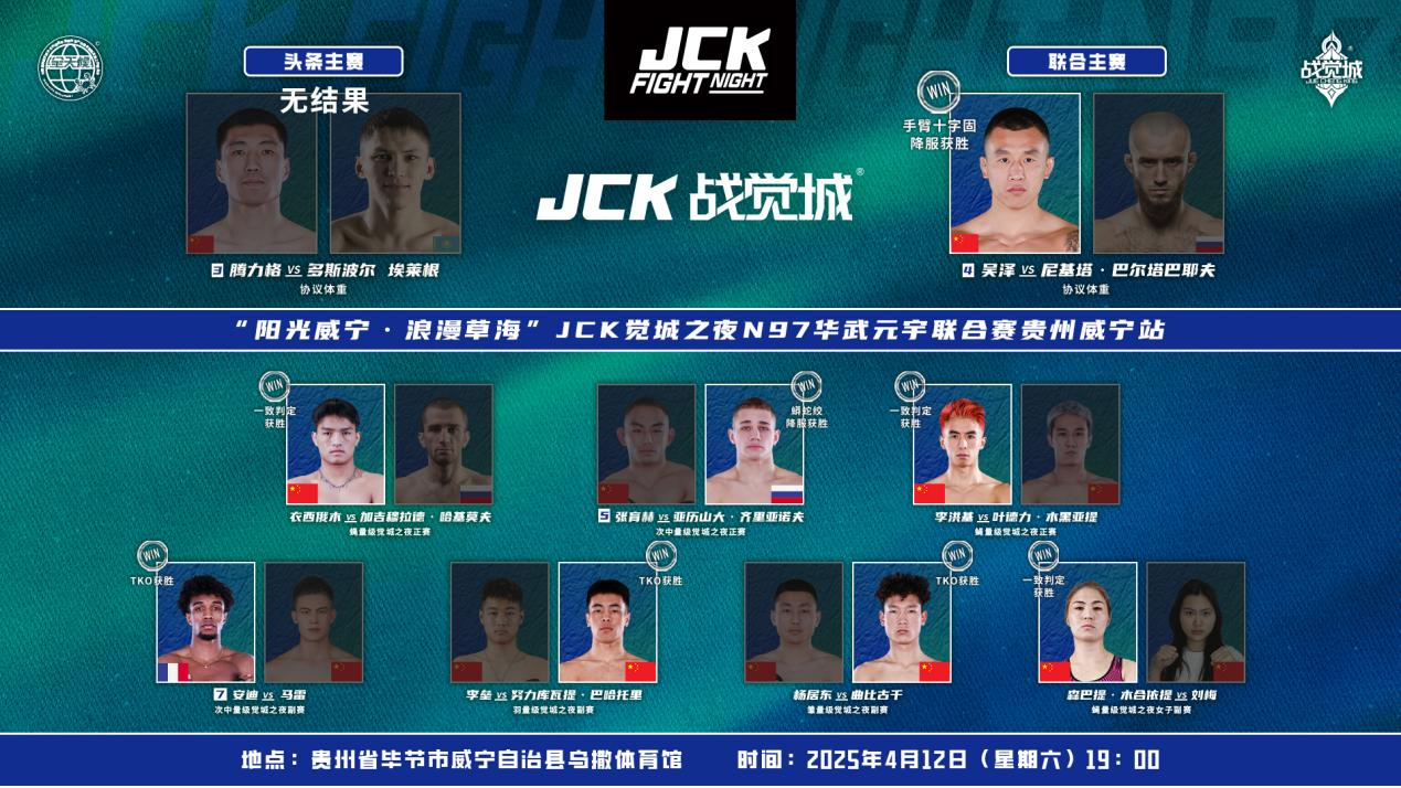 2025年4月12日,“阳光威宁·浪漫草海”JCK觉城之夜N97华武元宇联合赛贵州威宁站战罢,头条主赛腾力格VS多斯波尔 埃莱根,无结果;联合主赛吴泽手臂十字固降服尼基塔·巴尔塔巴耶夫;正赛加吉穆拉德·哈基莫夫赛前超重,未能终结对手,衣西俄木获胜,亚历山大·齐里亚诺夫蟒蛇绞降服张育赫,李洪基一致判定战胜叶德力·木黑亚提;男子副赛安迪、努力库瓦提·巴哈托里、曲比古千均TKO取胜;女子副赛森巴提·木合依提一致判定战胜刘梅。