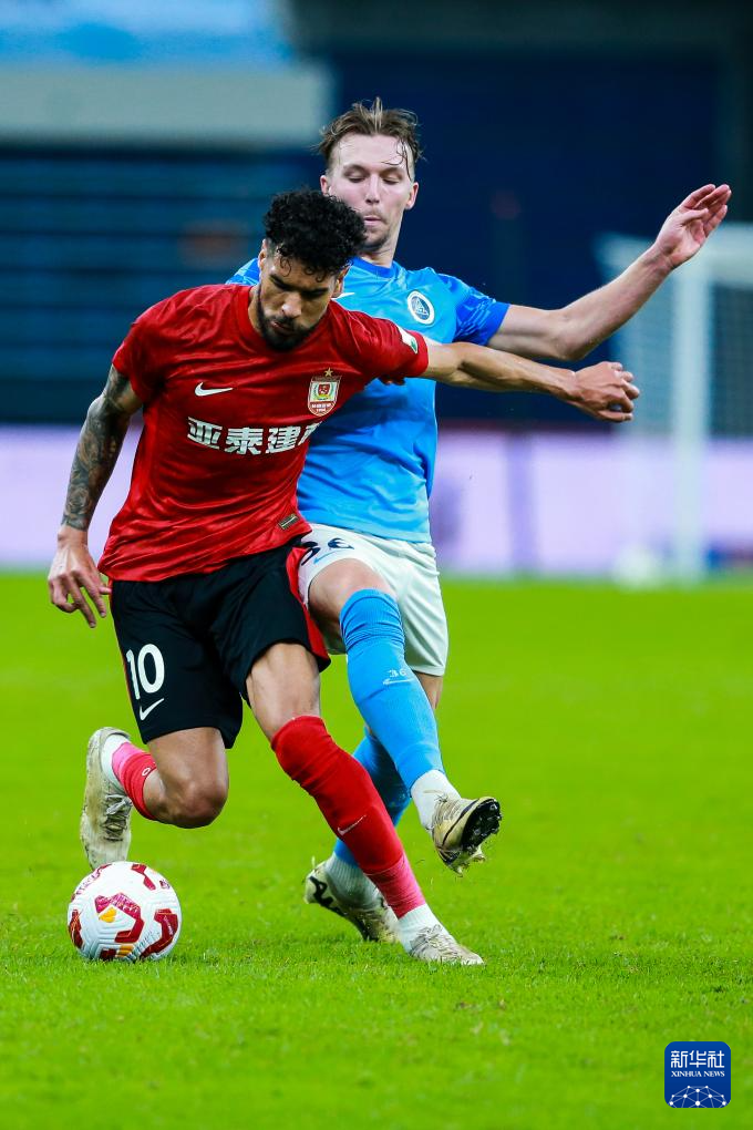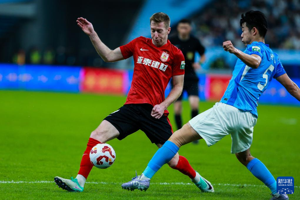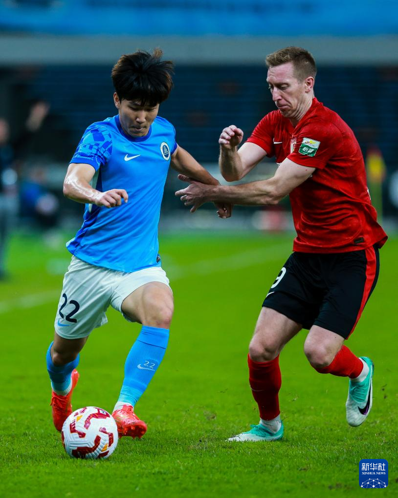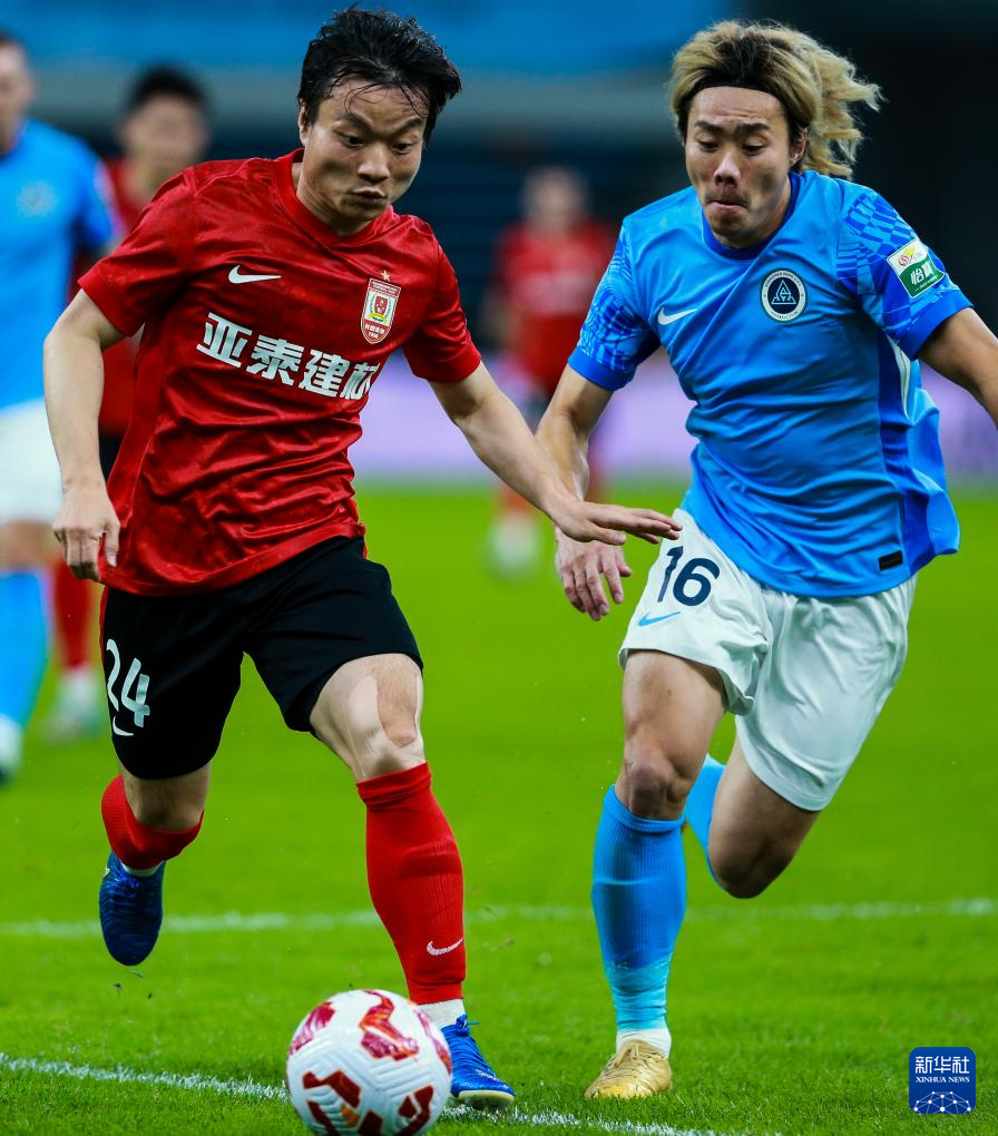 4月15日,长春亚泰队球员贝里奇(左)在比赛中与深圳新鹏城队球员胡睿宝拼抢。