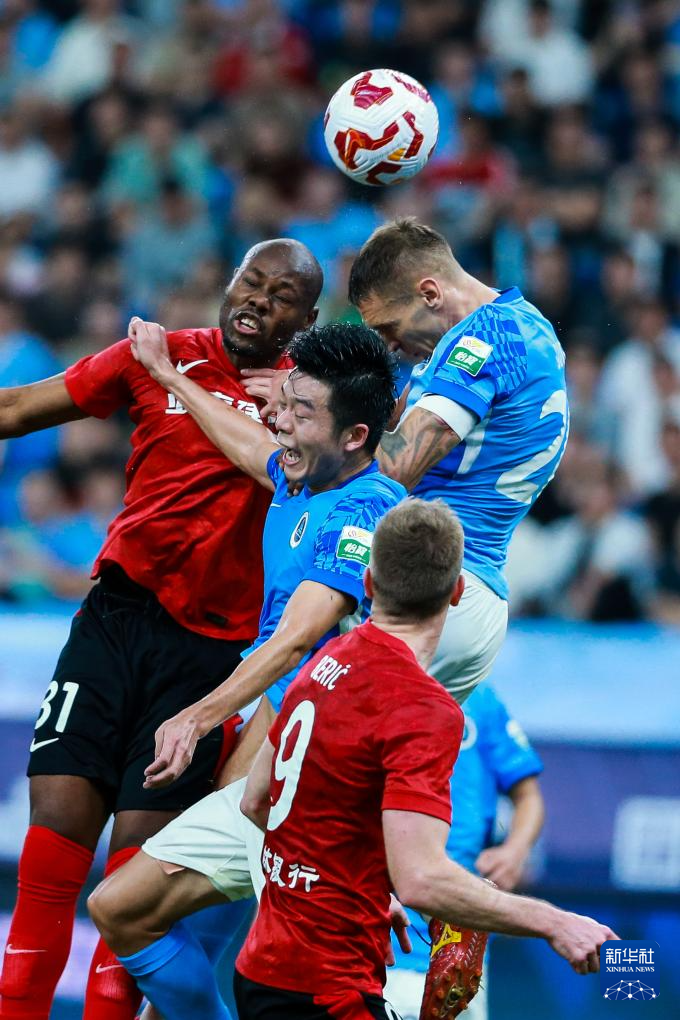 4月15日,长春亚泰队球员苏祖(左上)与深圳新鹏城队球员杜加利奇(右上)在比赛中争顶。