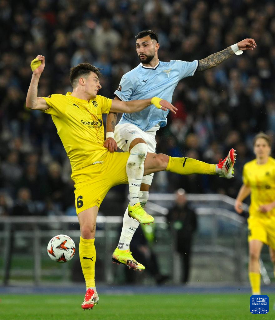 4月17日,拉齐奥队球员罗韦拉(左)与博德闪耀队球员加斯帕·霍在比赛中拼抢。