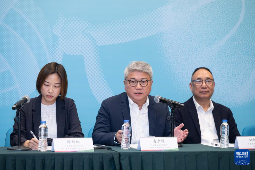 4月21日,第十五届全国运动会及全国第十二届残疾人运动会暨第九届特殊奥林匹克运动会澳门赛区组织委员会秘书长兼筹备办公室主任潘永权(中)在新闻发布会上发言。
