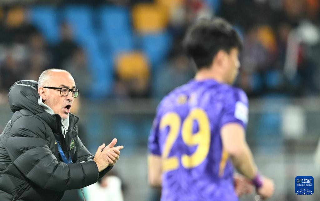 4月20日,浙江俱乐部绿城队主教练卡内达(左)在场边指挥。
