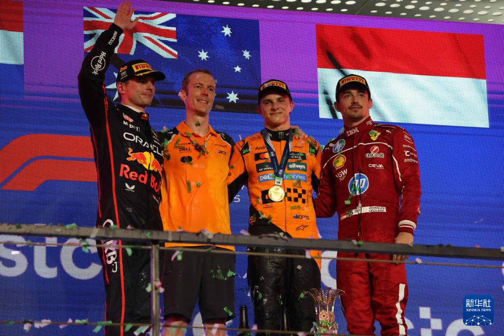4月20日,冠军迈凯伦车队澳大利亚车手皮亚斯特里(右二)、亚军红牛车队荷兰车手维斯塔潘(左一)和季军法拉利车队摩纳哥车手勒克莱尔(右一)在颁奖仪式上合影。