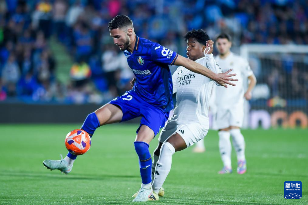 4月23日,皇家马德里队球员恩德里克(右)和赫塔菲队球员胡安·伊格莱西亚斯在比赛中拼抢。