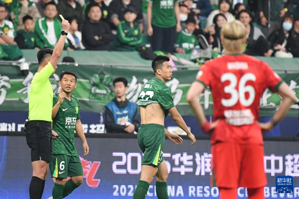 4月25日,北京国安队球员王刚(右二)在比赛中被主裁判杜健鑫(左一)出示黄牌。