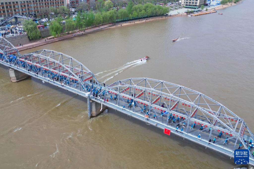 4月25日,兰州市基层工会的职工代表在健步走活动中经过黄河中山桥(无人机照片)。