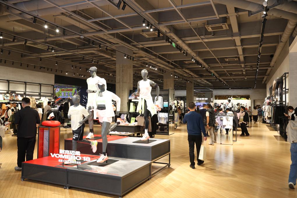 清明节假期,位于成都春熙路的劲浪体育·金开运动中心日均客流量高达2万人次。来到一楼的体育用品店,跑步装备被“C位”展示。