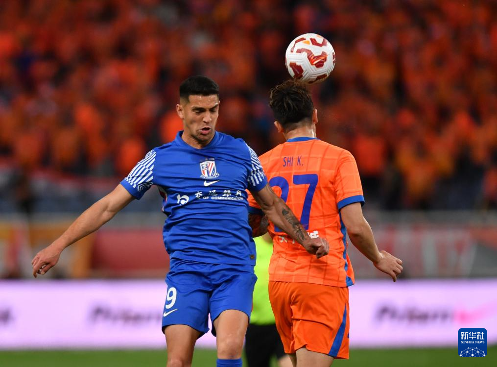 4月26日,上海申花队球员安德烈·路易斯(左)与山东泰山队球员石柯争顶。
