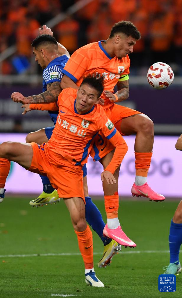 4月26日,山东泰山队球员克雷桑(上右)在比赛中。