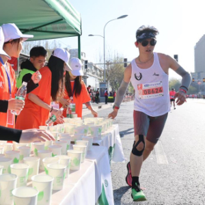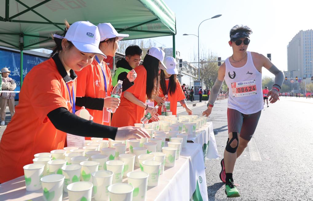 参赛选手在跑步过程中补水。新华社发(张晓峰 摄)