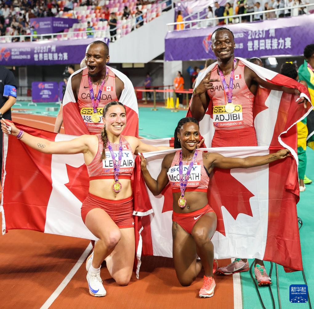 当日,2025年世界田联接力赛混合4x100米接力决赛在广州天河体育中心举行。