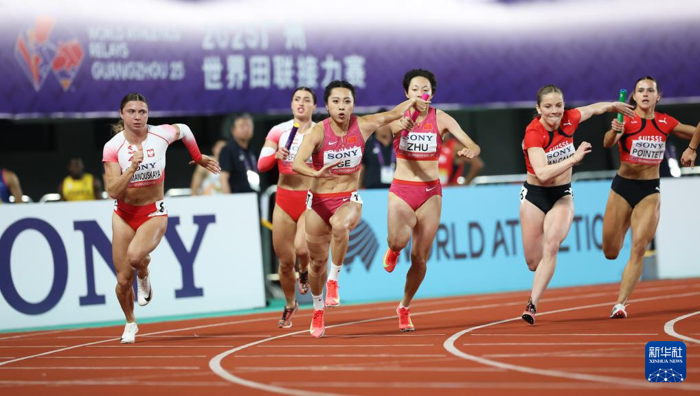 5月11日,中国队第三棒选手朱俊颖(右三)与第四棒选手葛曼棋(左三)在比赛中交接棒。