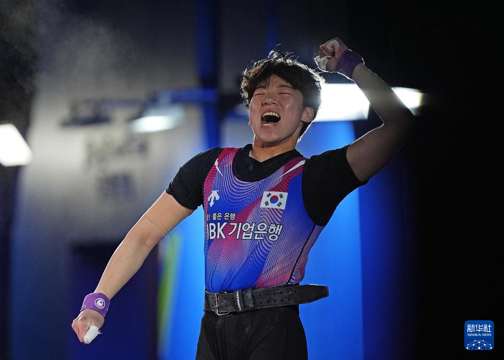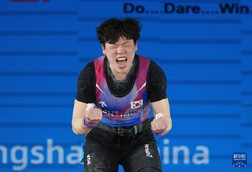 5月11日,韩国选手文敏姬在比赛中庆祝试举成功。最终,她获得抓举、挺举、总成绩三项季军。