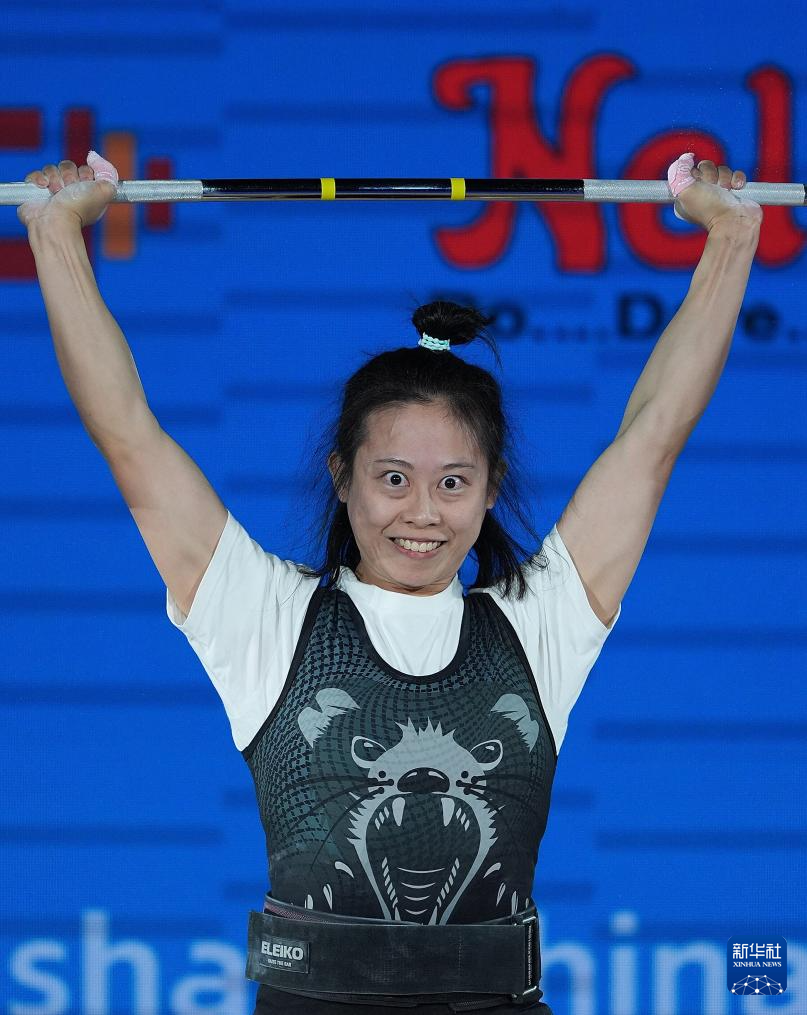 5月11日,中国选手李霜在比赛中。最终,她获得抓举、挺举、总成绩三项冠军。