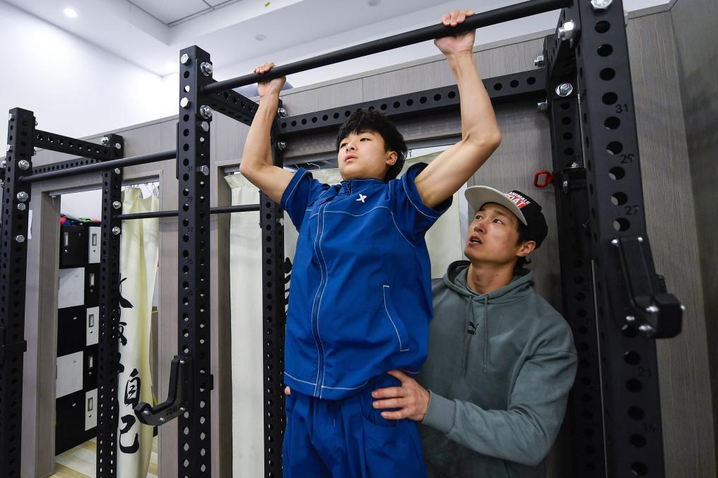 ↑崔圣雨(左)在教练任义指导下进行力量训练(5月7日摄)。