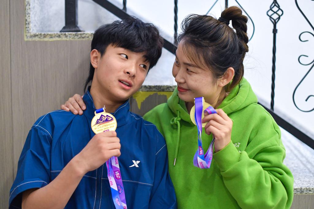 ↑崔圣雨(左)与母亲宋春秀手持在2025年U15世界中学生夏季运动会上收获的两枚金牌合影(5月7日摄)。