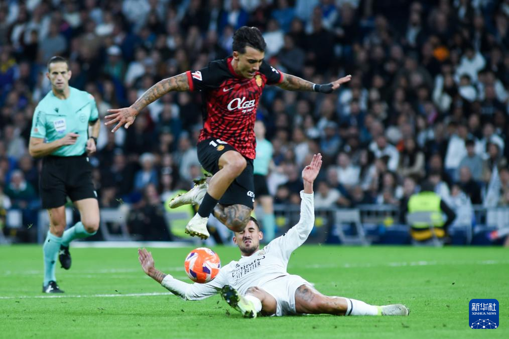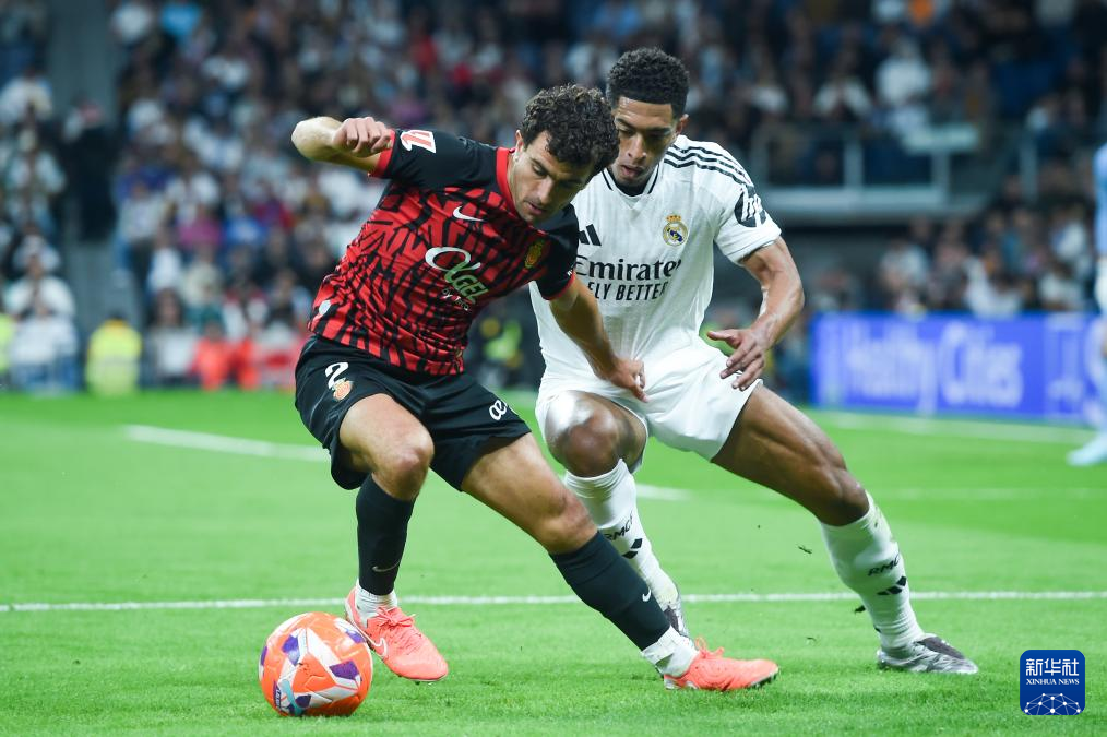 5月14日,皇家马德里队球员贝林厄姆(右)与马略卡队球员马特乌·莫雷伊在比赛中拼抢。