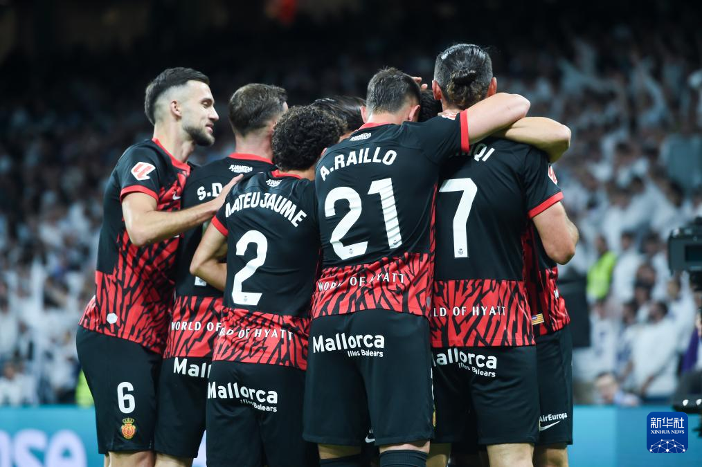5月14日,马略卡队球员在比赛中庆祝进球。