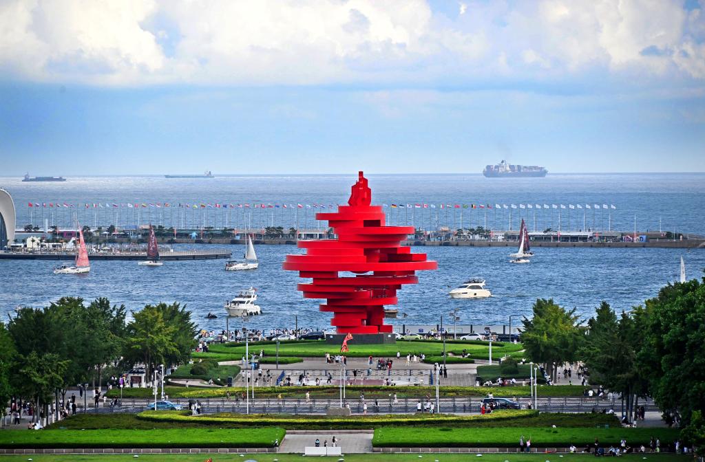从五四广场远眺青岛奥林匹克帆船中心(2024年8月19日摄)。新华社记者 李紫恒 摄