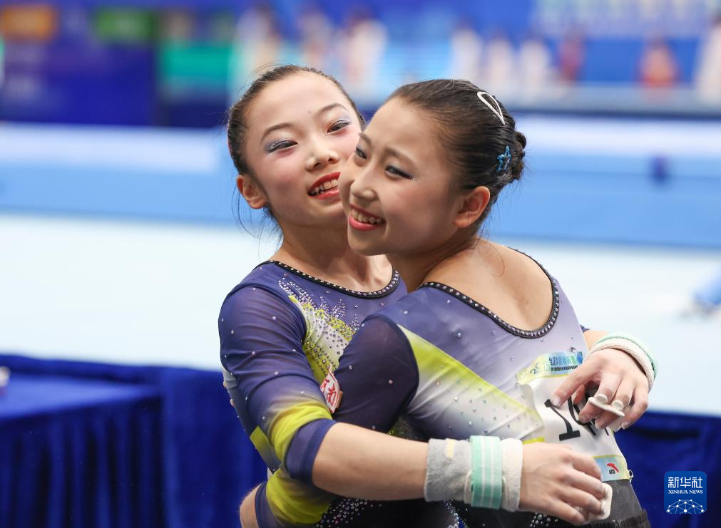 5月18日,河南队选手张晓轩(左)在女子团体决赛高低杠比赛后与队友张婉宁拥抱庆祝。最终,河南队获得季军。