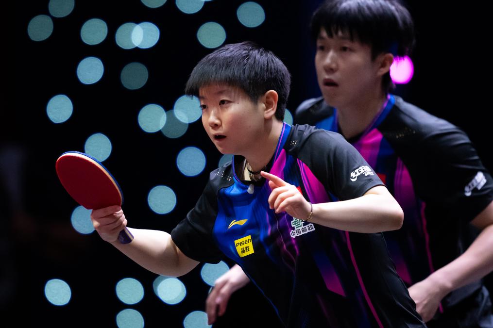 5月19日,王楚钦/孙颖莎(左)在比赛中。新华社记者 肖艺九 摄
