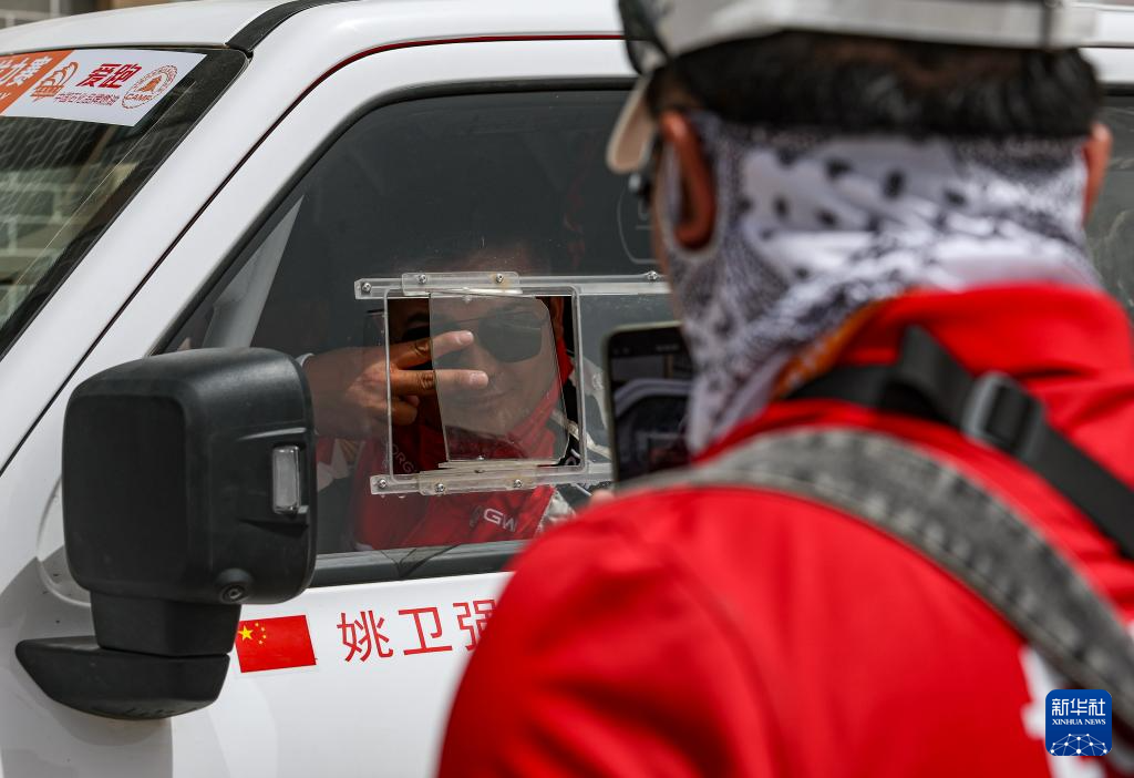 5月20日,长城哈弗车队车手孙相燕(上右)、领航员马欣(上左)在发车仪式上。