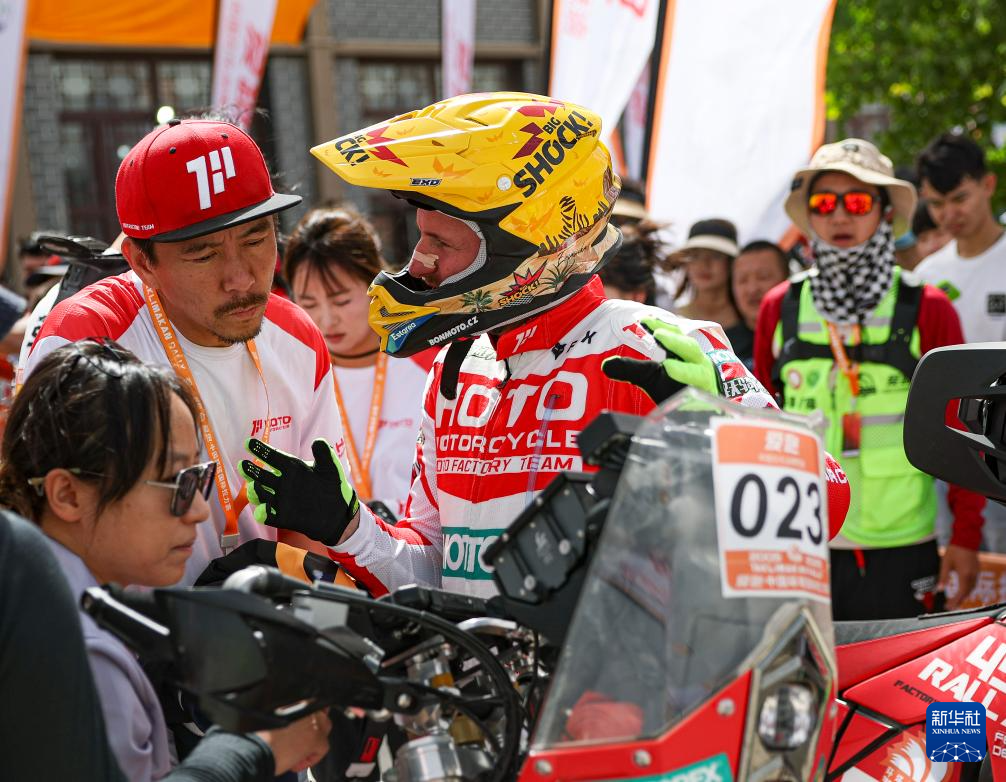 5月20日,红驼机车厂队一队捷克车手马汀(前右)在发车仪式前和工作人员交流。