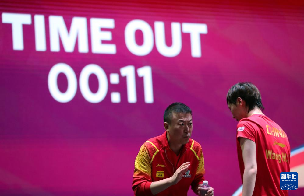 5月21日,教练马琳(左)在比赛间隙指导王曼昱。
