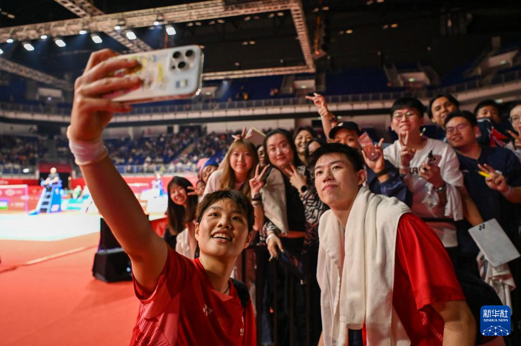 5月22日,冯彦哲(前右)/黄东萍(前左)在比赛后与球迷互动。