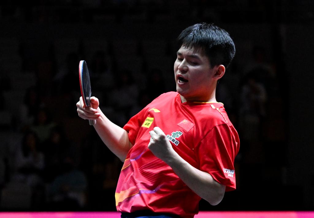 5月21日,林诗栋在比赛中庆祝得分。新华社记者 贺长山 摄