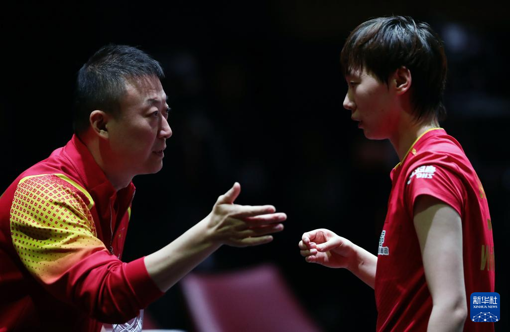 5月23日,教练马琳(左)在比赛间隙指导王曼昱。