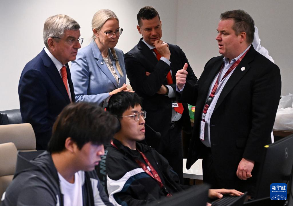 5月23日,国际奥委会主席巴赫(右二)在工作区考察由中国公司运行的“鹰眼”系统。