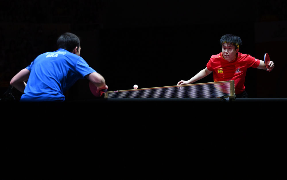 ↑王楚钦(右)与雨果·卡尔德拉诺在比赛中。新华社记者 贺长山 摄