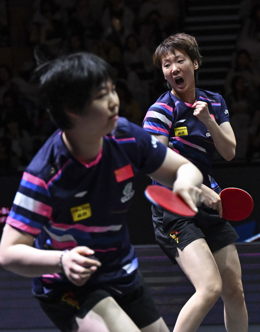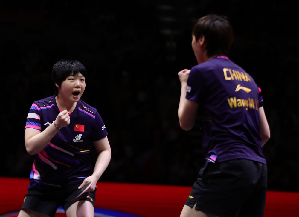 ↑ 王曼昱/蒯曼(左)在比赛中庆祝得分。新华社记者 王东震 摄