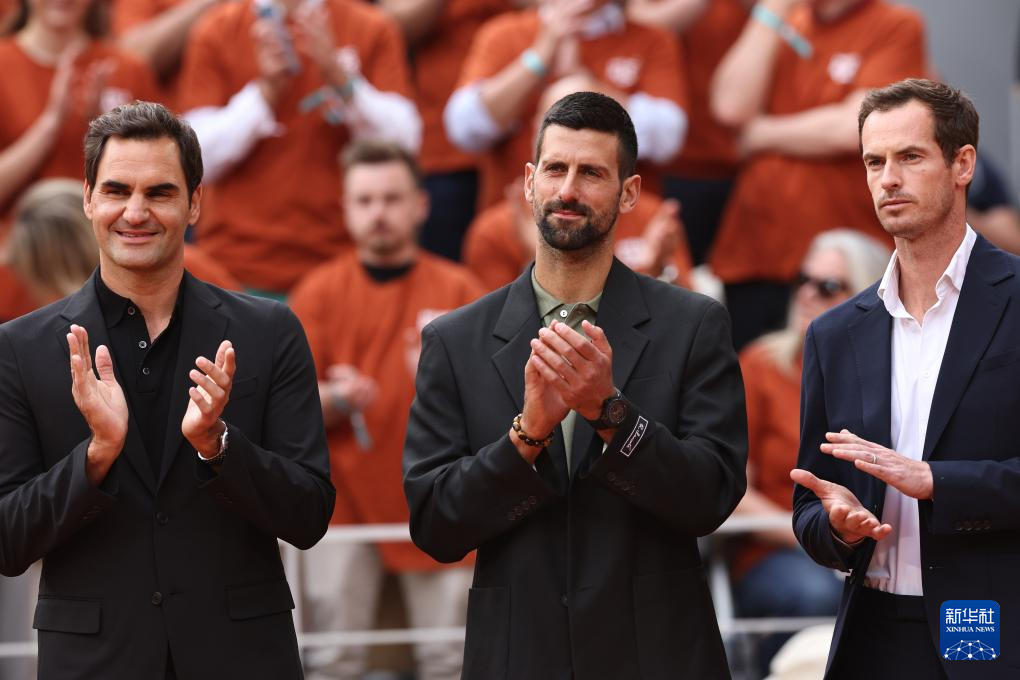 5月25日,费德勒、焦科维奇和穆雷(从左至右)在致敬仪式上。