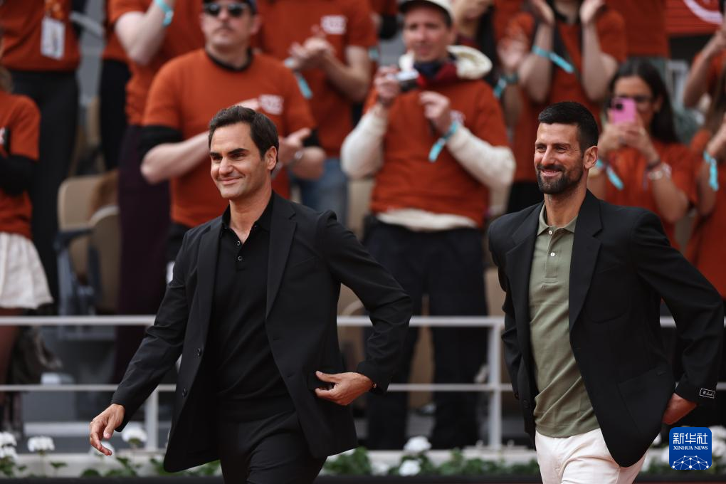 5月25日,费德勒(左)与焦科维奇出席致敬仪式。