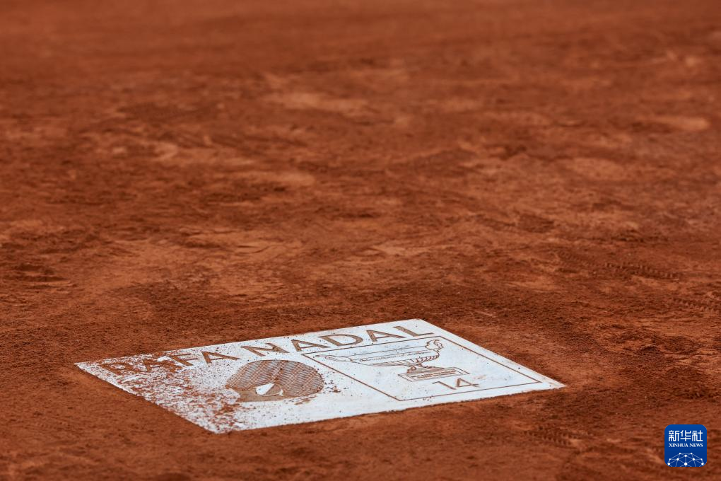 这是5月25日在菲利普·夏蒂埃球场拍摄的刻有纳达尔名字、鞋印和象征14个冠军奖杯的印章。