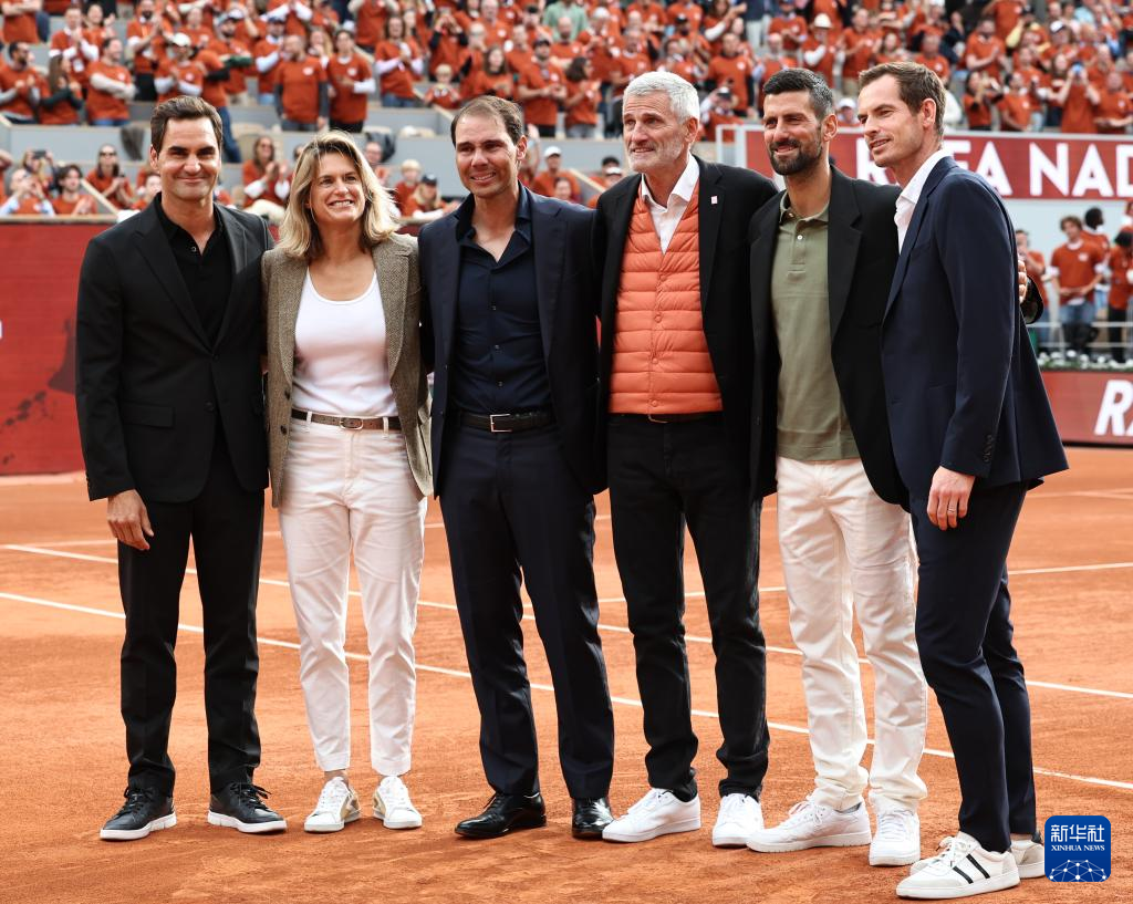 5月25日,费德勒、法网赛事总监阿梅莉·毛瑞斯莫、纳达尔、法国网球协会主席吉勒·莫敦、焦科维奇和穆雷(从左至右)在致敬仪式上合影。