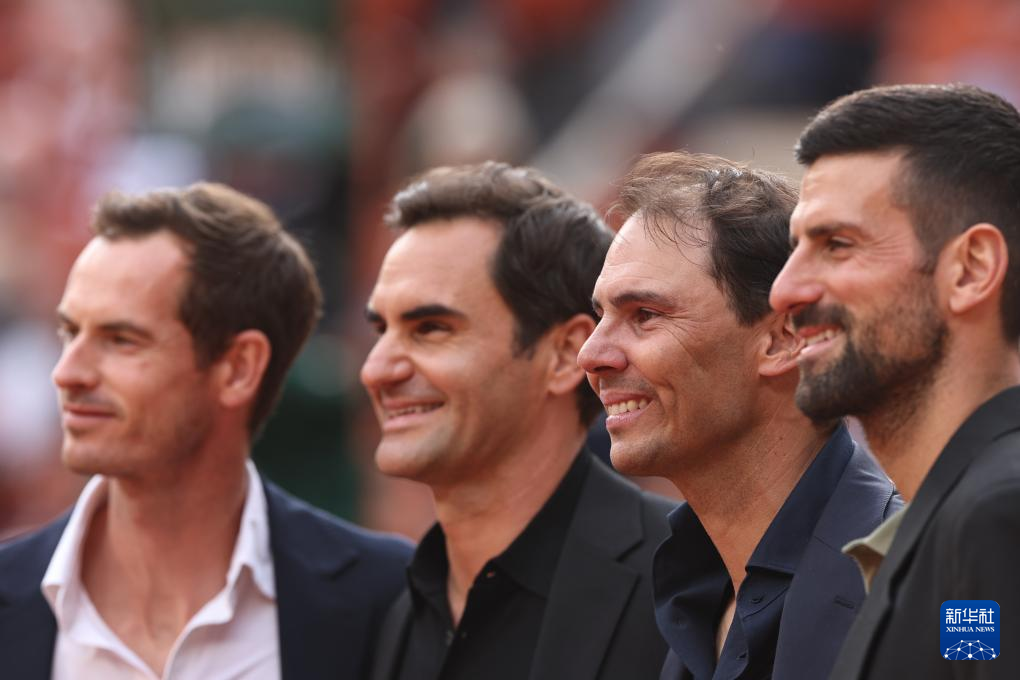 5月25日,焦科维奇、费德勒、纳达尔和穆雷(从左至右)在致敬仪式上合影。
