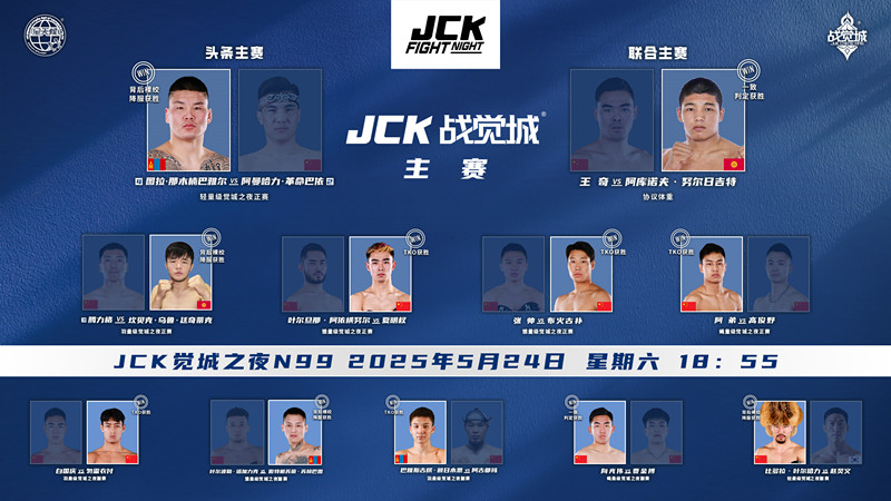 2025年5月24日,JCK觉城之夜N99结束,头条主赛图拉·那木楠巴雅尔背后裸绞降服阿曼哈力·革命巴依;联合主赛阿库诺夫·努尔日吉特一致判定战胜王奇;正赛部分坎贝克·乌鲁·廷奇蒂克背后裸绞降服腾力格,夏明权、布火古补、阿弟均TKO获胜;副赛部分勿雷衣付、巴雅斯古楞·额日木恩分别TKO白国庆、阿古都玛,向光伟一致判定战胜贾金搏,傲特根苏荣·苏赫巴图、比多拉·叶尔哈力均背后裸绞降服取胜。