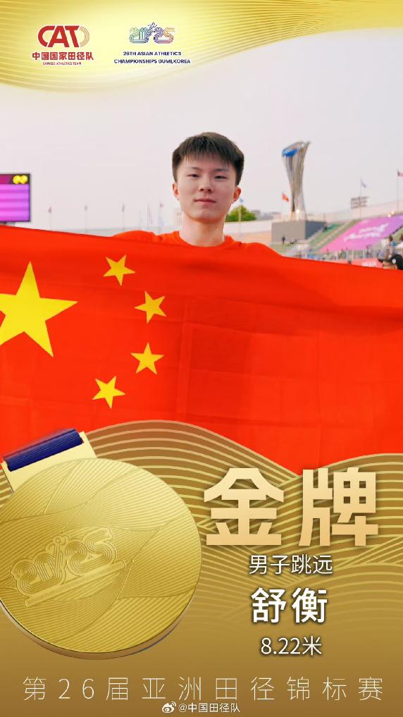 男子跳远比赛中,中国队选手舒衡最后一跳跳出8.22米,刷新个人最好成绩,收获一枚金牌,中国台北队选手林昱堂和日本队选手山浦溪斗分获银牌和铜牌。另一位中国队选手张溟鲲位列第四。