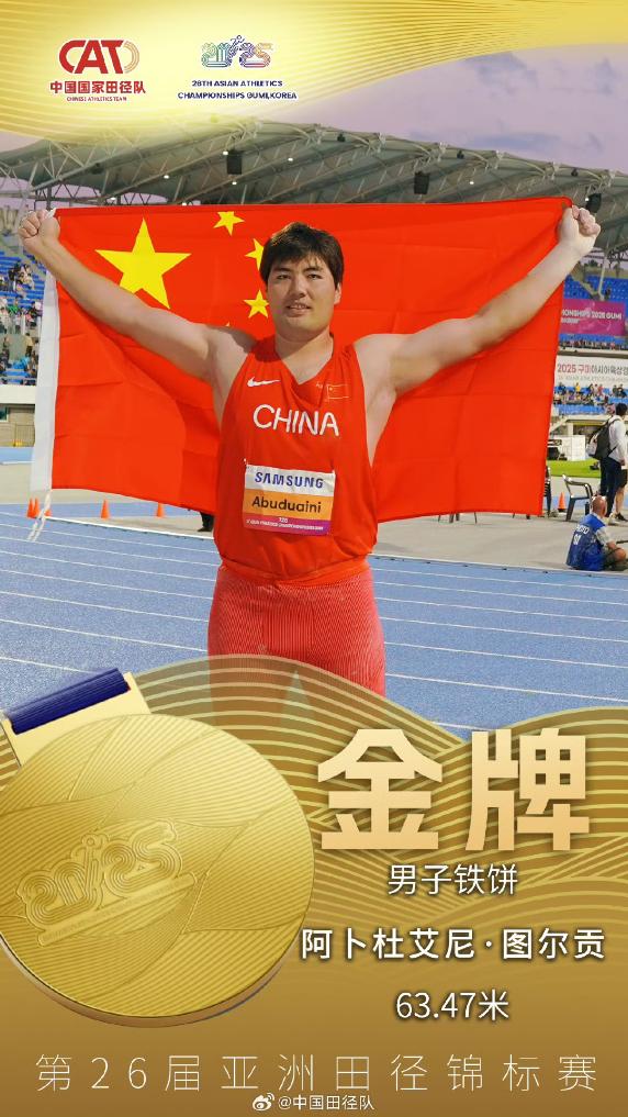 男子铁饼比赛中,中国队的阿卜杜艾尼·图尔贡以63.47米、领先第二名逾3米的绝对优势拿下金牌,这一成绩也是他个人赛季最佳。