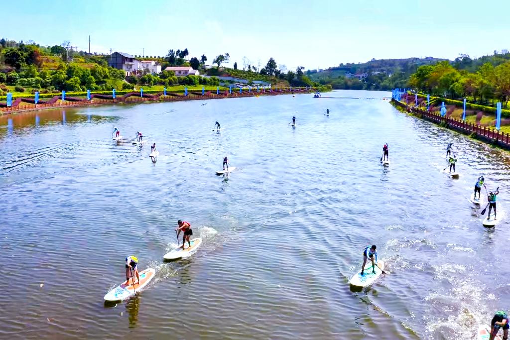 ↑运动员在重庆渝北区大洪河上参加桨板比赛