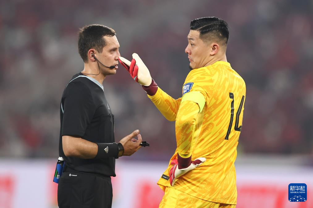 6月5日,中国队守门员王大雷(右)在比赛中与裁判交流。