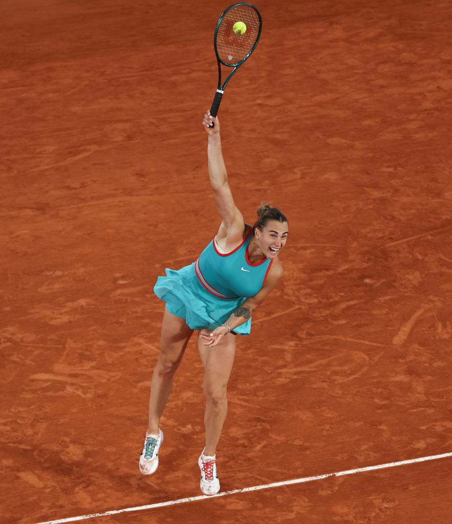 6月5日,萨巴伦卡在比赛中发球。