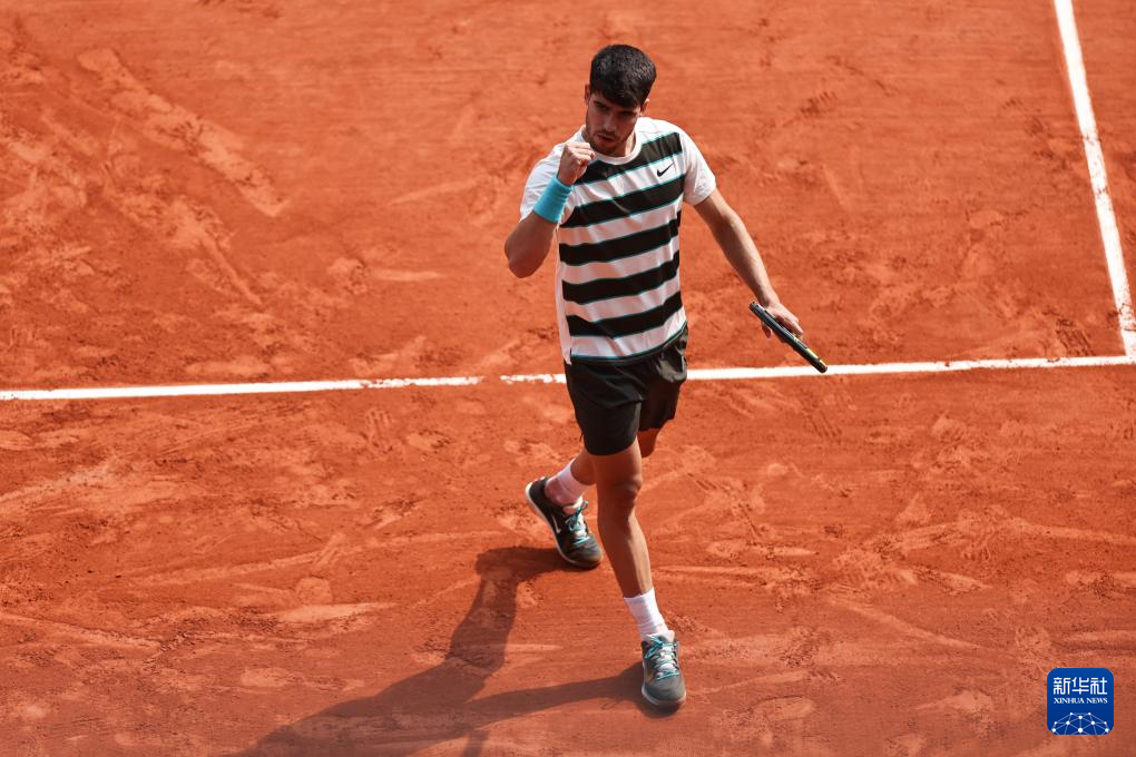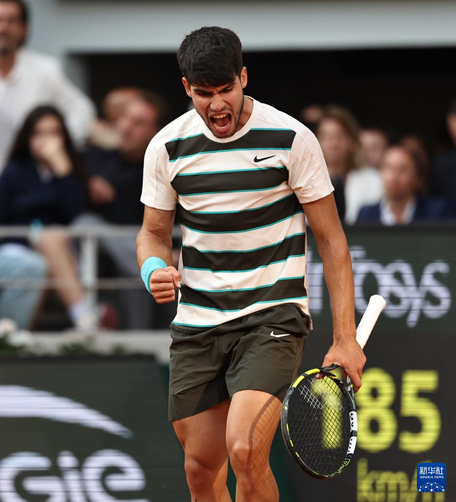 6月8日,阿尔卡拉斯在比赛中庆祝得分。