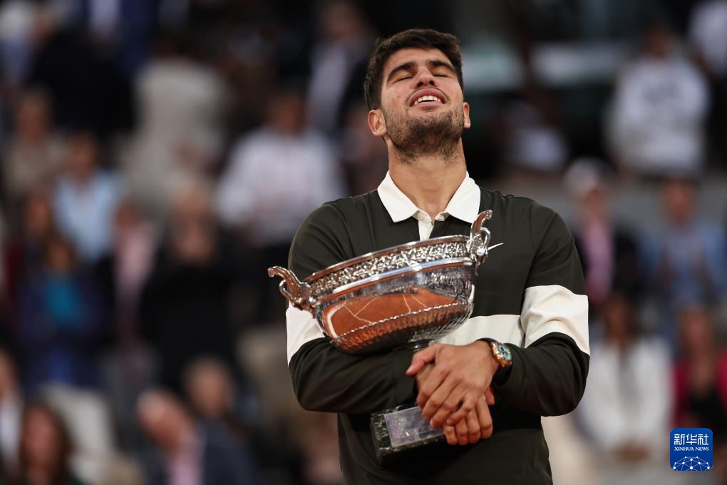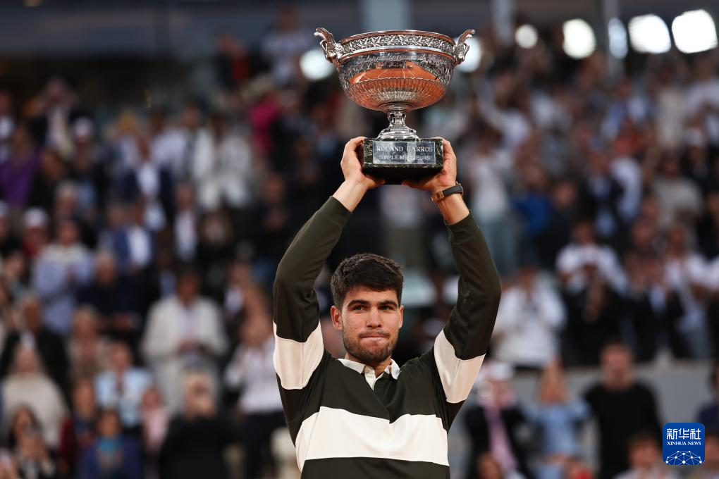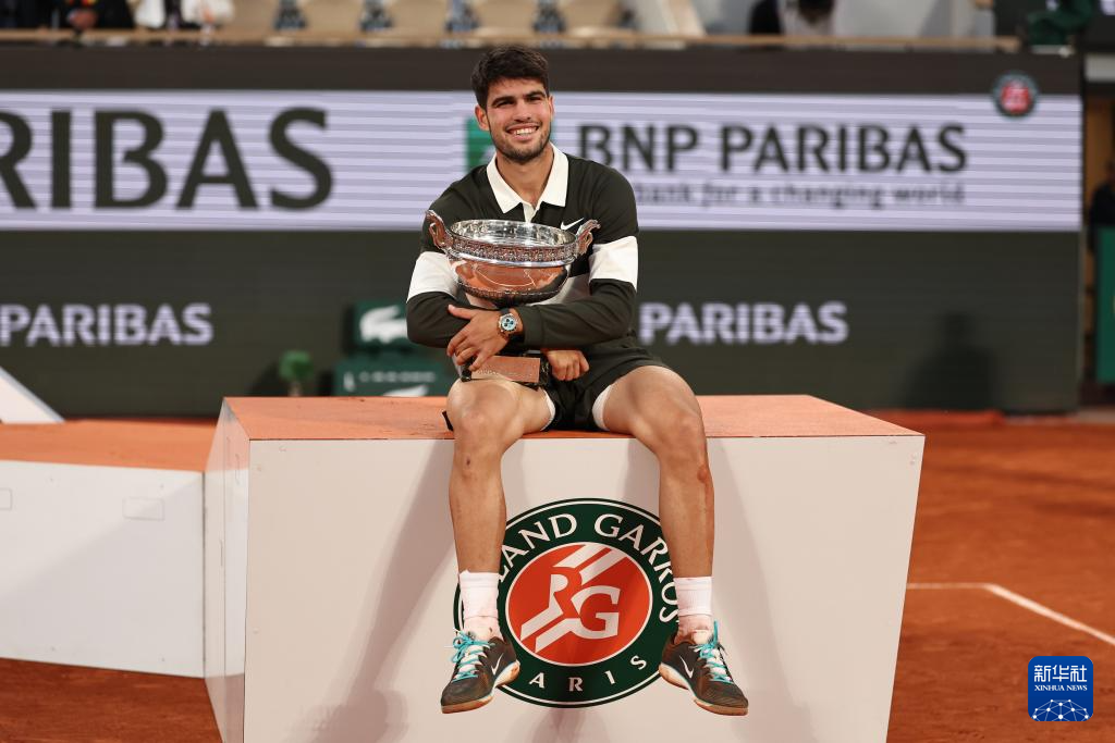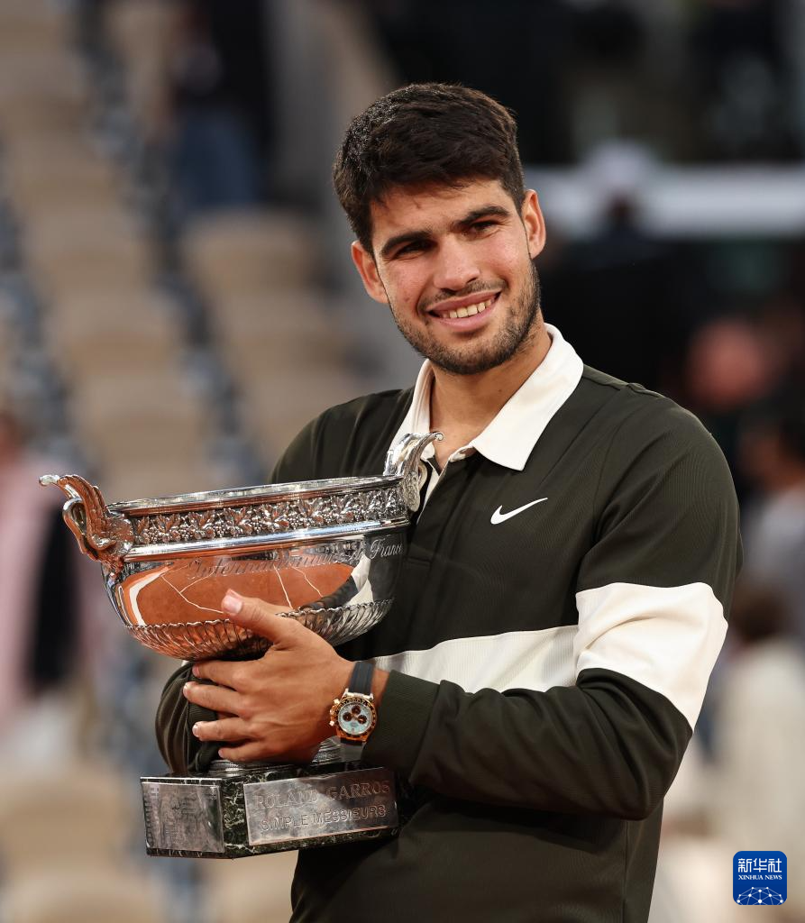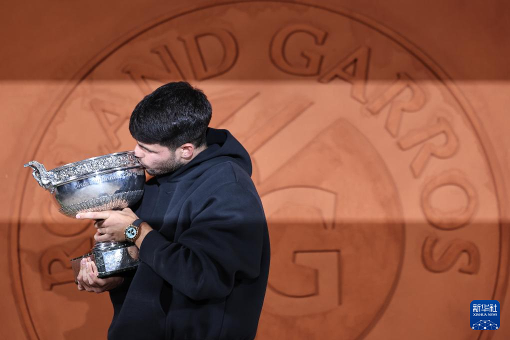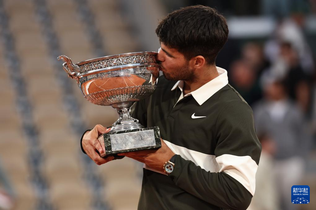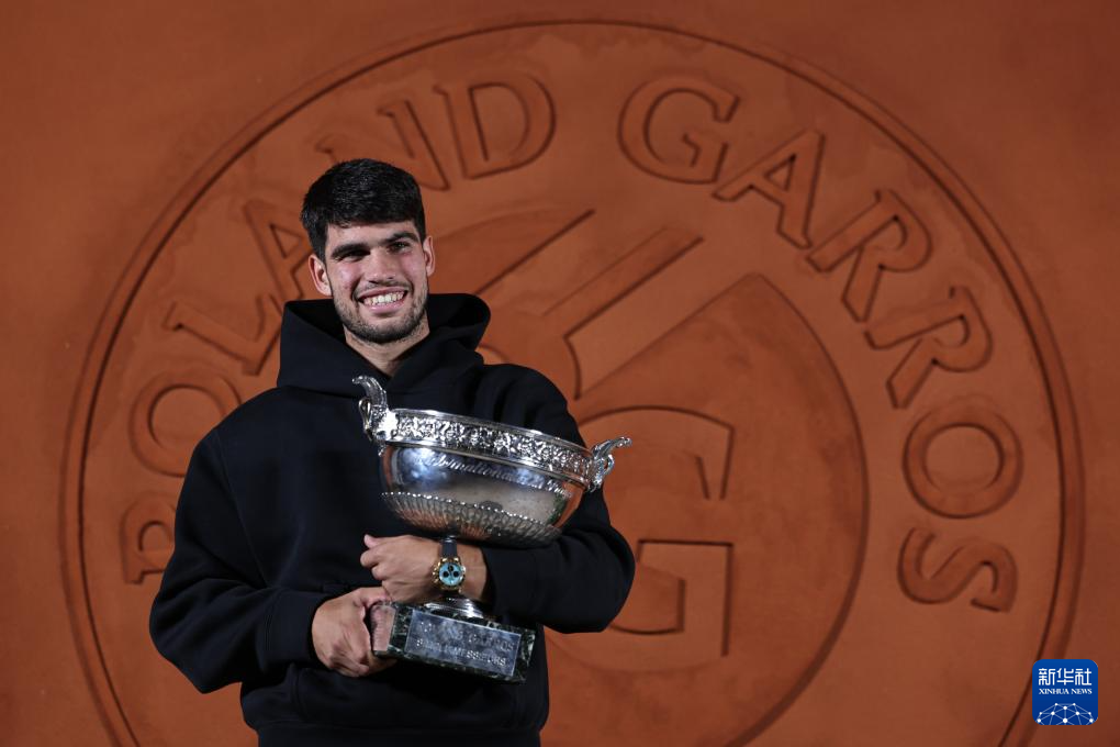 6月8日,阿尔卡拉斯在拍照仪式上与奖杯合影。