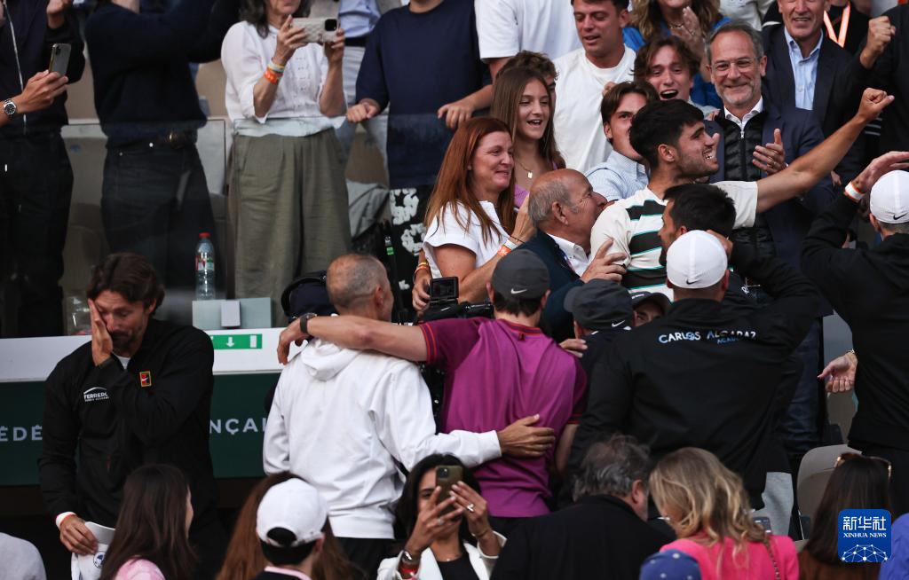 6月8日,阿尔卡拉斯在赛后庆祝,他的教练费雷罗(左一)在一旁擦拭眼泪。
