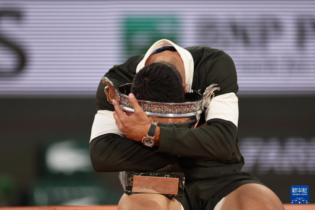 6月8日,阿尔卡拉斯在拍照仪式上亲吻奖杯。
