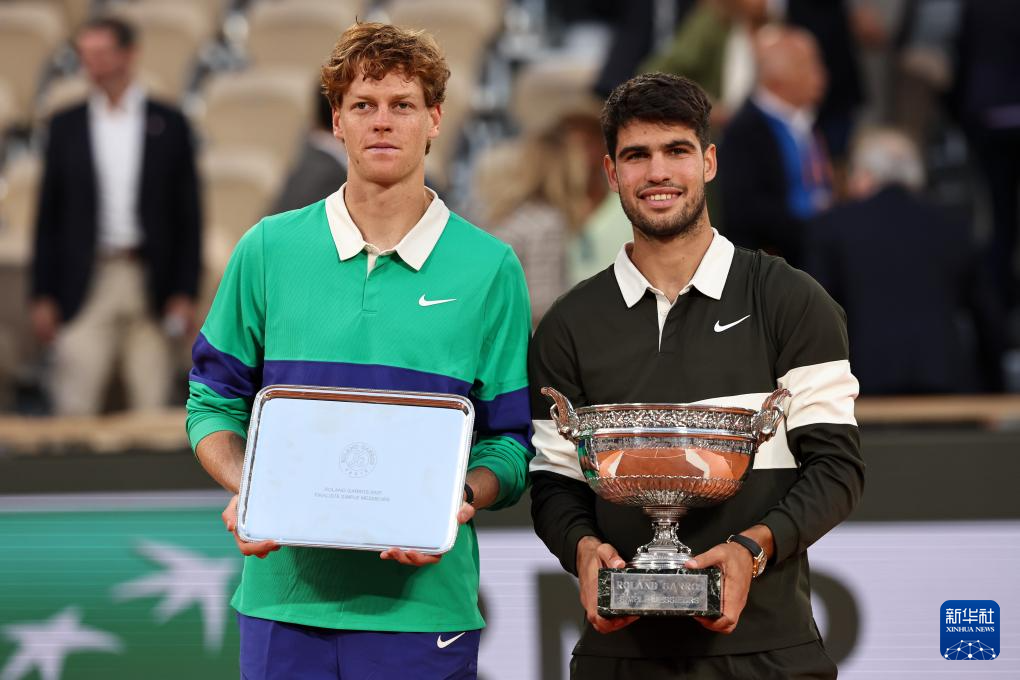 6月8日,阿尔卡拉斯(右)和辛纳在颁奖仪式上。